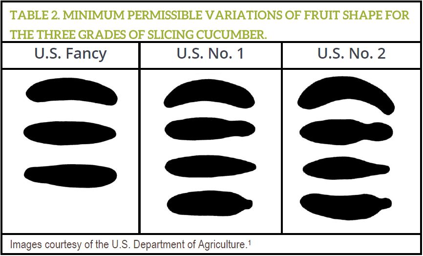 Shape – A “well formed” cucumber is “practically straight and not more than very slightly constricted or more than moderately tapered or pointed.”1 A “fairly well formed” cucumber may be “moderately curved but not deeply constricted, not extremely tapered or pointed and not otherwise misshapen” and a “badly deformed” cucumber is “so badly curved, constricted, tapered or otherwise so badly misshapen that the appearance is seriously affected” as defined by the USDA. Some variations of shape are allowed in with less variation in the U.S. Fancy grade and more variation in the U.S. No. 2 grade (Table 2).1