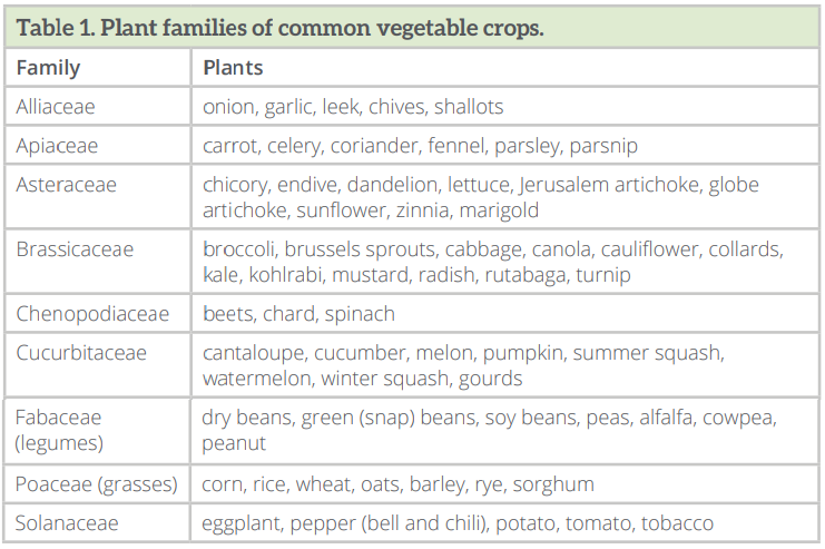 Crop rotation involves planting a sequence of different kind of crops in a location over a number of seasons (Figure 1). Rotating crops helps maintain or improve soil health and maintain or increase the productivity of the farm over time. To get the most benefit from rotation, growers should schedule sequential plantings based on rotational groups of plants belonging to the same plant family (Table 1).1,2 Vegetables belonging to the same family can be considered as a rotational group because they are susceptible to many of the same diseases and insect pests, share similar nutrient requirements, and are treated with similar pesticides.1