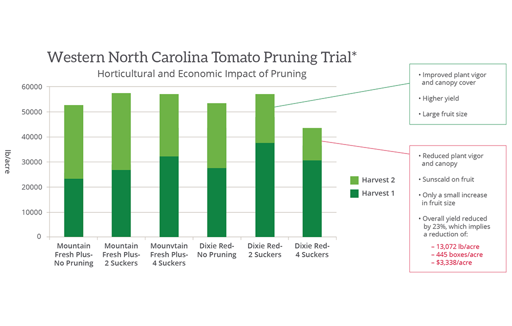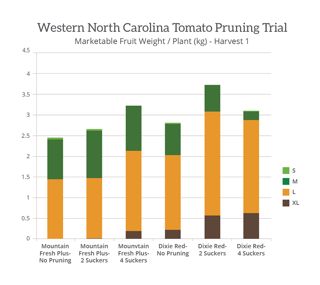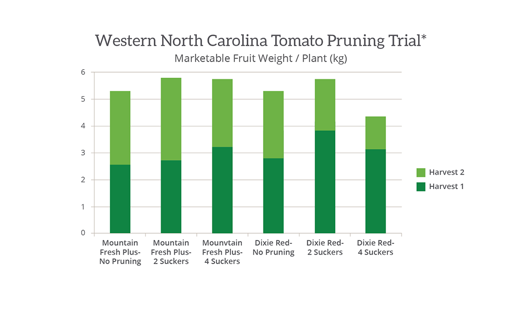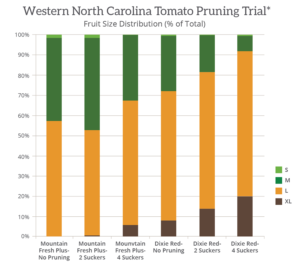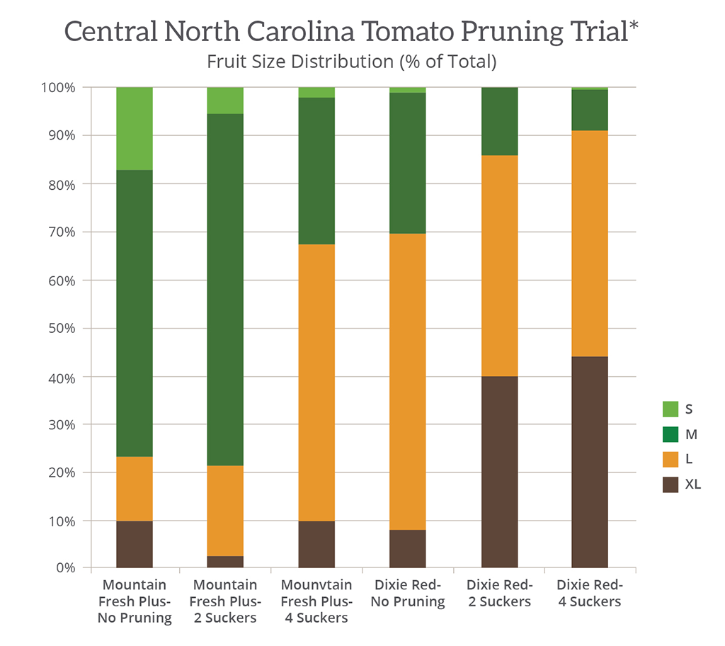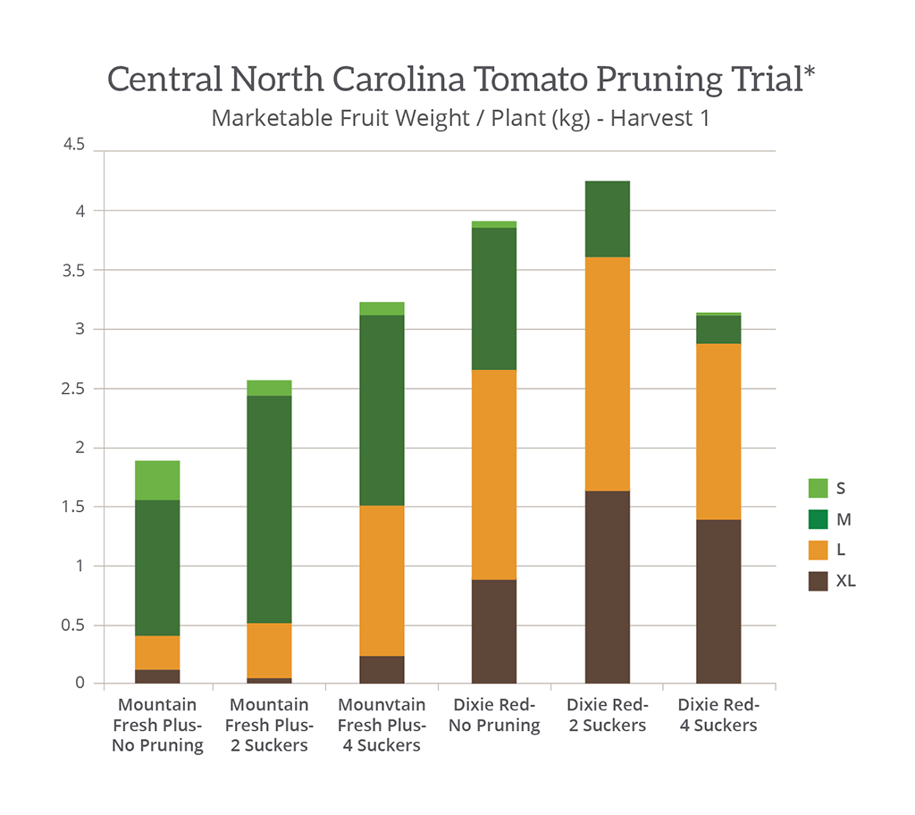 The most common error made by Dixie Red Tomato growers is overpruning. A number of tomato varieties call for pruning four suckers or zero suckers, and sometimes both those strategies are mistakenly applied to the Dixie Red Tomato. But when done correctly (two suckers), pruning your Dixie Red Tomato can improve plant vigor, increases canopy cover and leads to larger fruit sizes with higher yields as seen in the trial data below.