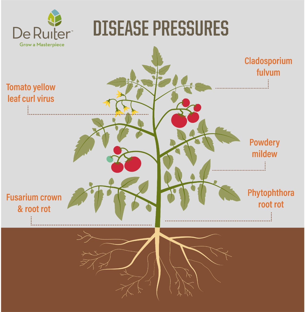 At De Ruiter™, we have been at the forefront of hybrid seed development and resistance breeding since 1946 and are building on our heritage. Today, we are vigilantly detecting emerging diseases around the world that can cause large-scale, economic damage, so we’re able to react quickly to develop new varieties with additional resistances. This ensures we can bring insights to our customers so they can have confidence in De Ruiter products. Below we’ve outlined a few important diseases and the dedicated innovation invested in De Ruiter seeds to help minimize pressure so our growers can grow a masterpiece.