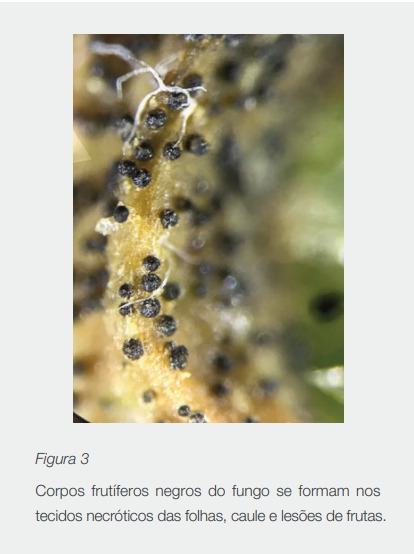 A fase onde a doença ataca os frutos ocorre quando os ramos estão severamente atacados5,6 e se caracteriza por lesões circulares que apresentam pequenos pontos pretos localizados no ponto de formação do fruto. Essas lesões são afundadas no centro e ao coalescer se expandem, a casca do fruto fica com coloração marrom e geralmente se rompem4,5. Pontuações pretas se formam no tecido necrosado da folha, caule ou fruto (Figura 3). Esses pontos são os conídios do fungo (estruturas para dispersão).