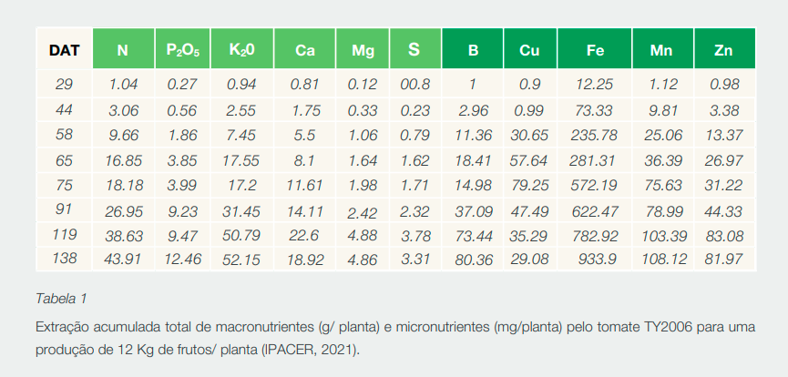 Os estudos da curva de extração de nutrientes foram conduzidos de março a agosto de 2021 no Instituto de Pesquisa Agrícola do Cerrado (IPACER, Rio Paranaíba, MG), sob condições controladas, submetidos a correção da saturação de bases, adubações corretivas do solo, fertirrigação ao longo de todo o ciclo da cultura, manejo fitossanitário e condução intensiva, buscando a maximização do potencial produtivo do TY2006. Para uma produtividade total de 12 Kg de frutos por planta, com massa média de 116 gramas e 106 frutos colhidos/ planta, foram extraídos 52,15 g/ planta de K2O; 43,91 g/ planta de N; 18,92 g/ planta de Ca; 12,46 g/ planta de P2O5 ; 4,86 g/ planta de Mg e 3,31 g/ planta de S, obedecendo a sequência K>N>Ca>P>Mg>S. No caso dos micronutrientes, o Fe foi o mais absorvido, com 933,9 mg/ planta, seguido de Mn (108,12 mg/ planta), Zn (81,97 mg/ planta) , B (80,36 mg/ planta) e Cu (29,08 mg/ planta).
