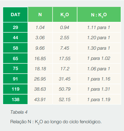 A relação entre os teores de N e de K2O mostra um ponto de inflexão na fase de enchimento de frutos, aos 65 dias após o transplante (dat), em que a relação é praticamente de 1:1, com incrementos cada vez crescentes nos teores de K até o final da colheita. A manutenção das relações entre o N e o K2O, que deve ser estimado nas diferentes condições de cultivo, é fundamental para o correto estabelecimento e desenvolvimento da planta e para assegurar a produtividade e a qualidade dos frutos.