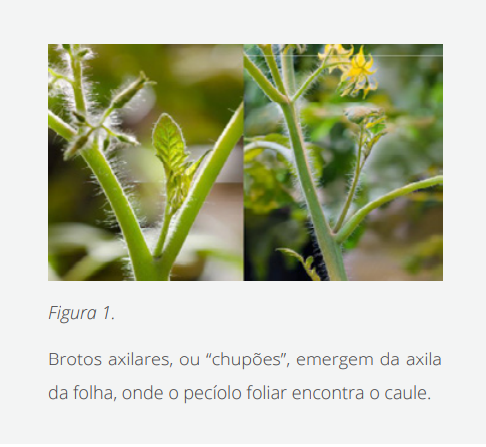 A desbrota de tomates envolve a remoção de brotos axilares, comumente conhecidos como “chupões” ou “sugadores”, que brotam ao longo de todas as hastes da planta. Os “chupões” desenvolvem-se a partir da axila, onde o pecíolo foliar encontra o tronco, formando-se em cada nó foliar (Figura 1). Se não forem removidos, os “chupões” se desenvolvem como brotos que produzem folhas e frutos. A folhagem adicional e os tecidos dos frutos competem com o resto da planta por água, nutrientes e luz, muitas vezes resultando em mais frutos, porém menores. 1