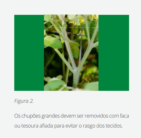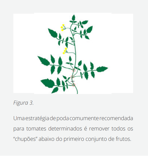 Os “chupões” menores podem ser facilmente removidos com os dedos, em um movimento para os lados até partilos. Os “chupões” maiores devem ser removidos com uma faca ou tesoura afiada para evitar o rasgo dos tecidos. Uma recomendação padrão para variedades determinadas é remover todos os “chupões” (cinco ou seis) localizados imediatamente abaixo do primeiro conjunto de flores (Figura 3). Todos os “chupões” acima do primeiro conjunto de frutos devem ser deixados para que cresçam e produzam frutos. Em variedades fortemente determinadas, às vezes é recomendado deixar um ou dois “chupões” abaixo do primeiro cacho de frutos para melhorar o rendimento global. 4