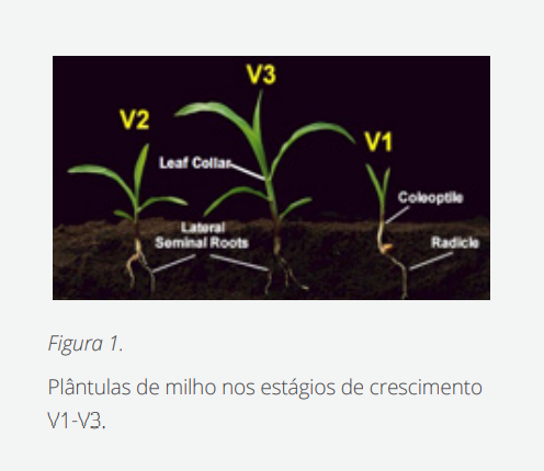 Estágios V5-V6 - Durante estes estágios inicia-se o desenvolvimento da espiga e pendão, assim como determina-se o número de linhas do grão. O ponto de crescimento da planta de milho está perto da superfície.
