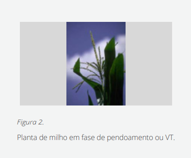 Estágio VT - A fase de pendoamento começa quando o último ramo do pendão é visível, mas os cabelos das bonecas ainda não emergiram (Figura 2). Pendões normalmente aparecem 2-3 dias antes da emergência dos cabelos. A liberação do pólen ocorre tipicamente na manhã ou no entardecer.