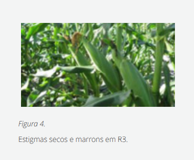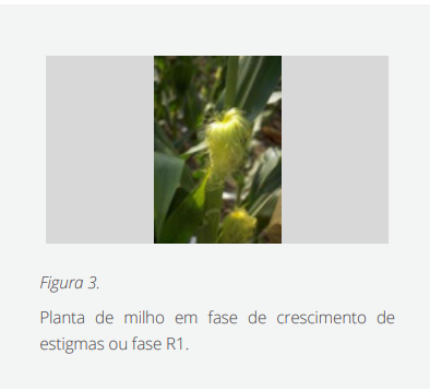 Estágio R1 – Essa fase inicia quando os cabelos (estilo-estigmas) estão visíveis para fora da espiga (Figura 3). O pólen cai sobre os cabelos para potencialmente fertilizar os óvulos. Cada óvulo pode produzir um grão individual. Estresse de umidade neste momento pode causar a desidratação dos cabelos e / ou grãos de pólen, podendo causar granação irregular da espiga.