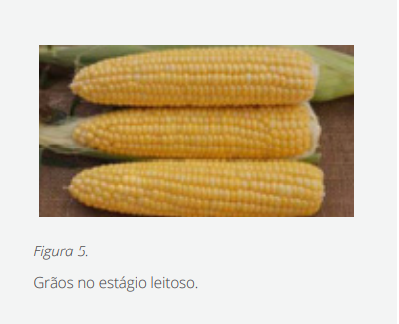 O milho doce estará pronto para a colheita no estádio R3, aproximadamente 25 a 30 dias após o surgimento dos estilo-estigmas, dependendo das condições ambientais. Na colheita, os estigmas na ponta da espiga apresentam coloração castanha e aspecto seco (Figura 4). Quando um grão é pressionado pela unha, um líquido leitoso deve emergir indicando que o campo está pronto para a colheita (Figura 5). É muito importante colher rapidamente no estágio apropriado porque os açúcares no milho doce podem rapidamente converter ao amido, tornando o milho inapropriado para consumo fresco ou processado.³
