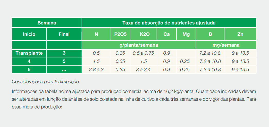 A extração de B foi de 244 g/ha, recomendamos o uso de fontes de liberação lenta ou aplicação em parcelas, 1,6 a 2,5 kg/ha podem ser aplicados metade no plantio e o restante em fertirrigações ao longo do ciclo. Zn extraído foi de 21,87 mg/planta ou 164 kg/ha; considerando uma taxa de recuperação média, podemos fornecer de 3 a 4 kg/ha de Zn via oxissulfatos misturados ao adubo de plantio.