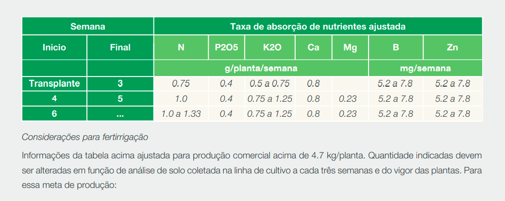 - Além da curva de absorção avaliar o vigor vegetativo para melhor ajuste da adubação com N. Após iniciado o cresci mento dos frutos pode-se estimar a produtividade potencial e ajustar o N para 2,1 g/planta para cada kg de frutos que se espera produzir;