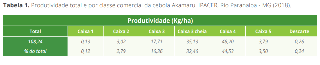 A relação N: K2O para o híbrido Akamaru foi de 1: 0,56 e as extrações relativas de N, P2O5 e K2O (kg de nutriente por tonelada produzida de cebola) foram 3,59; 0,57 e 2,01 kg/tonelada, respectivamente.
