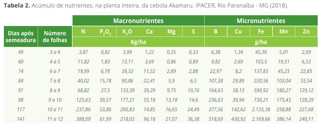 1. IPACER - Instituto de Pesquisa Agrícola do Cerrado. 2018. Curva de acúmulo de nutrientes para cultura da cebola, variedade Akamaru – Safra 2018. Rio Paranaíba, MG.