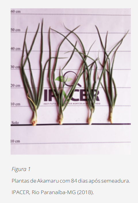 A variedade Akamaru foi semeada em 21/07/2018, com layout de quatro fileiras duplas por canteiro de 1,75 metros de largura e colhida em 09/11/2018.