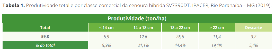 A cenoura SV7390DT atingiu 59,8 t/ha (2.062 caixas de 29 Kg/ha), com 96,8% de raízes comerciais (Tabela 1). A maior percentagem de raízes ocorreu nas classes de maior valor comercial.