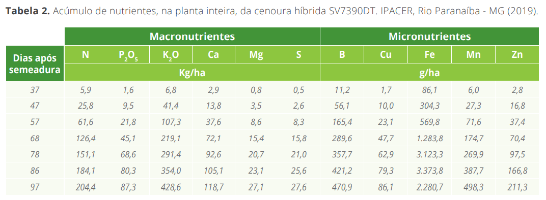 1. IPACER - Instituto de Pesquisa Agrícola do Cerrado. 2019. Curva de acúmulo de nutrientes para cultura da cenoura, variedade SV7390DT – Safra 2019. Rio Paranaíba, MG.