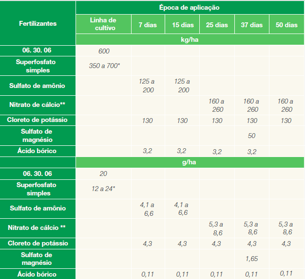 • Não misturar nitrato de cálcio com sulfato de magnésio em tanque de dissolução e dar preferência por intervalo de dois dias entre as aplicações indicadas. O sulfato de magnésio pode ser omitido em solos com pelo menos 0,9 cmolc/dm³ de Mg2+ na camada de 0-30 cm;