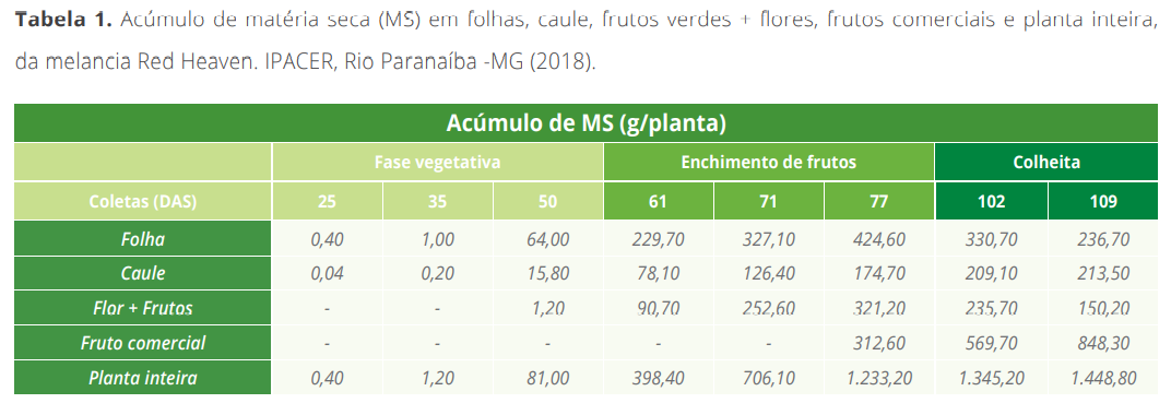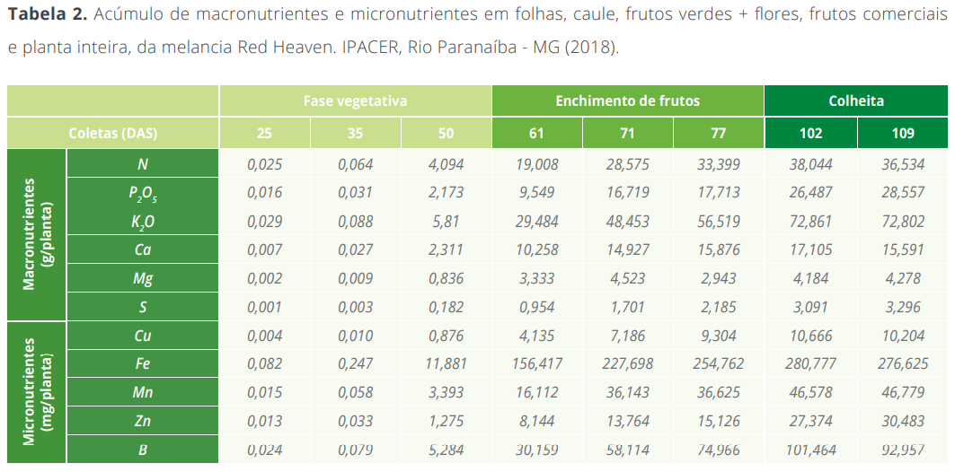 1. Os nutrientes mais acumulados pela melancia Red Heaven foram o K e N e cada kg de frutos demandam 2,93 g de N e 5,84 g de K2O, dos quais são exportados 1,39 g de N e 2,75 g de K2O;