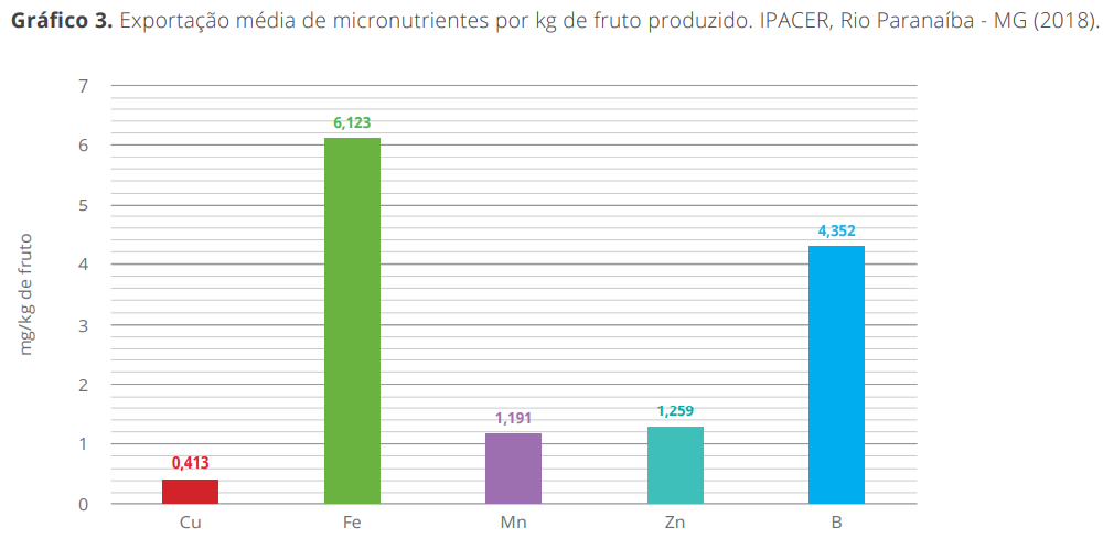 Importante considerar que a alta produtividade de frutos acarreta em alta remoção de nutrientes e por isso deve ser estabelecido um programa de adubação que considere a disponibilidade de nutrientes no solo e os dados de extração apresentados nessa pesquisa. No entanto, o programa de adubação não deve focar apenas na aplicação dos nutrientes, mas principalmente, no aproveitamento deles. O aproveitamento (e garantia de alta produtividade) precisa, sobretudo, de abundante crescimento do sistema radicular. O bom crescimento de sistema radicular requer correções nas limitações químicas, físicas e biológicas do solo. Dentre as limitações químicas citam-se a alta disponibilidade de Al3+ e a baixa disponibilidade de Ca2+. Essas limitações podem ser contornadas com incorporação profunda de calcário e em alguns casos, adição de gesso junto com calcário na fase de correção.