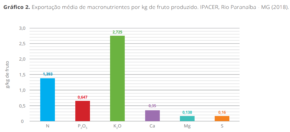 Diferente do comentado para N e K, não é possível relacionar apenas a exportação pelos frutos com a quantidade de P a ser aplicada, pois as interações de P com o solo são mais definidoras da adubação que a extração da planta. A planta exporta 0,647 g de P2O5 por kg de frutos colhidos.
