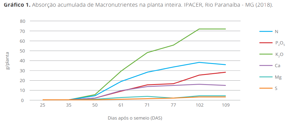 Além da demanda, conhecer a curva de absorção é importante. Isso porque a curva de absorção permite ao agricultor/técnico escolher a melhor época e doses dos fertilizantes a serem aplicadas. Assim, são aplicadas doses condizentes com a extração da cultura em determinado intervalo de tempo, minimizando perdas no sistema solo-planta-atmosfera e desequilíbrios iônicos no solo. O entendimento do padrão de absorção ao longo do ciclo dos nutrientes por novas cultivares é importante para a proposição do melhor manejo da adubação e alcance da maior produtividade.