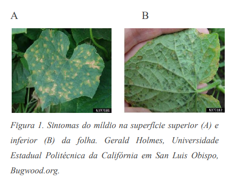 O míldio pode afetar plantas de todas as idades, mas em muitas regiões produtoras, ele aparece no final da safra.1,2 A infecção restringe-se principalmente às folhas, mas a redução resultante na área fotossintética provoca o raquitismo das plantas, rendimentos reduzidos e ressecamento do fruto, seguido de desfolhamento. Os sintomas iniciais são pequenas manchas cloróticas na superfície superior da folha, muitas vezes desenvolvendose primeiro nas folhas mais antigas, na base da planta (Figura 1). As lesões expandem-se e assumem uma forma angular, uma vez que são ligadas pelas veias principais da folha. O tecido infectado eventualmente se torna necrótico (morto) levando à morte da folha e ao desfolhamento. O crescimento de mofo de cor cinza a roxo desenvolve-se na parte inferior das folhas (Figura 1).