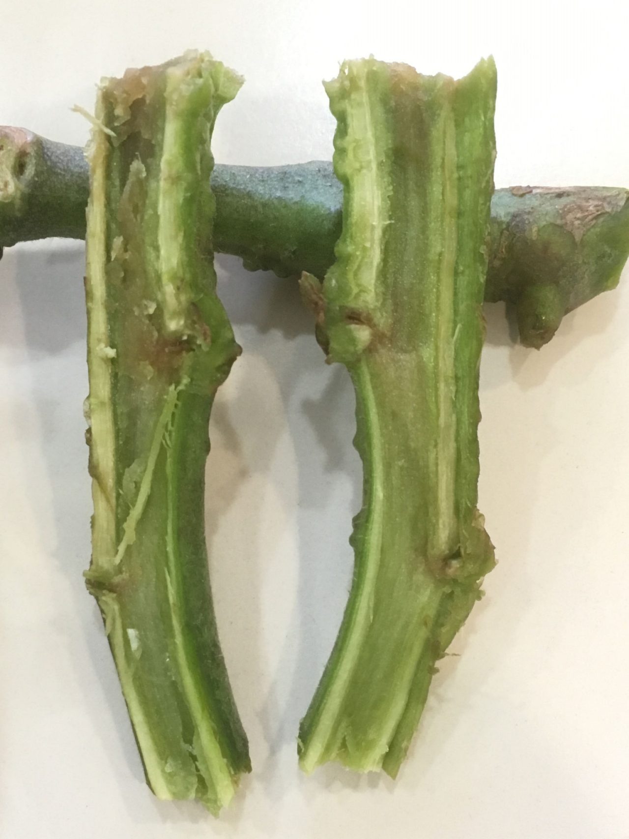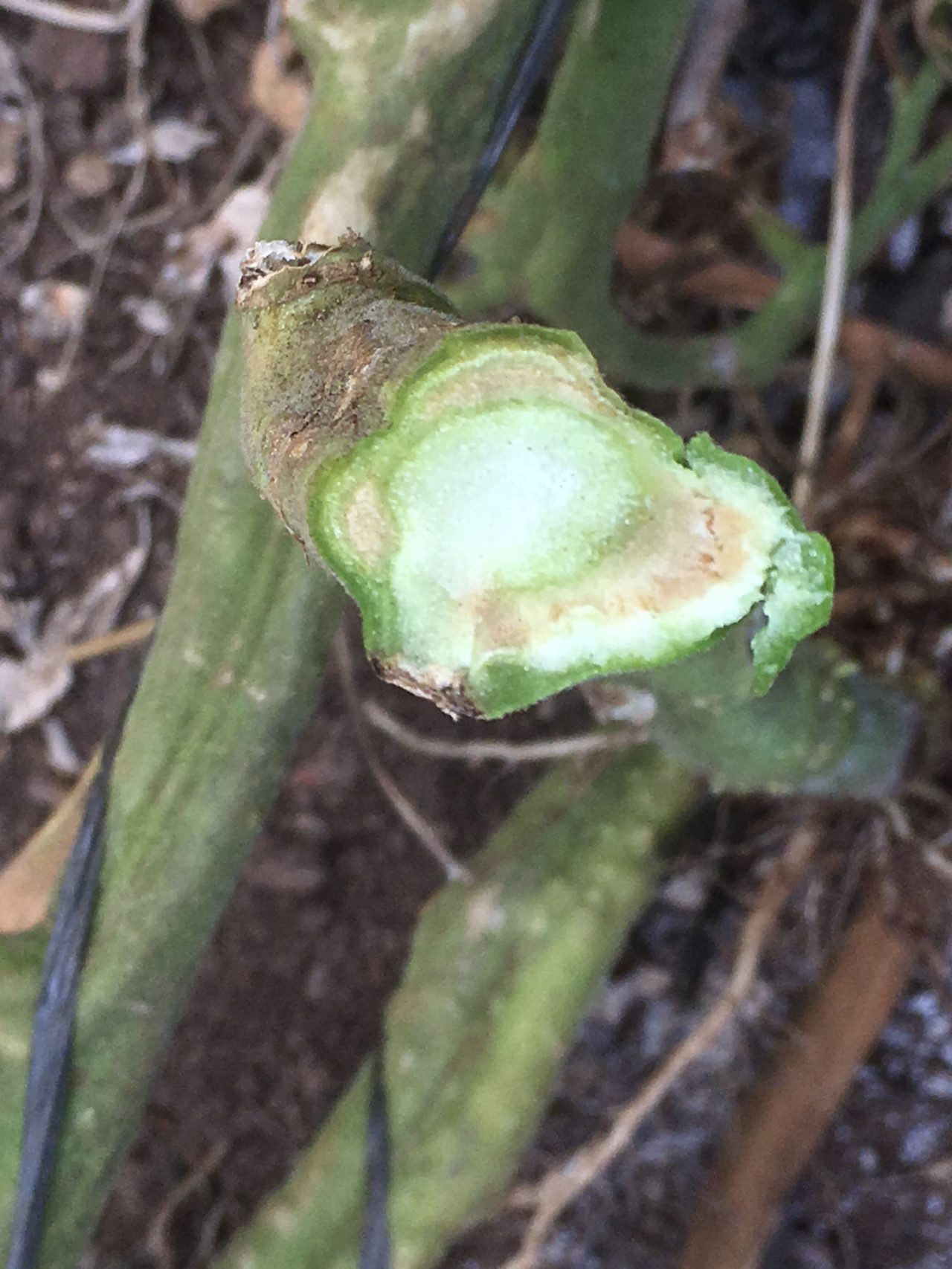 Atualmente, especialmente em sistemas de tomate enxertado, há a ocorrência bastante frequente de infecções mistas do Talo-oco com a Murcha-bacteriana, causadas pela bactéria Erwinia carotovora (Pectobacterium carotovorum) e pela Ralstonia solanacearum, respectivamente. Os sintomas se confundem no campo nas fases iniciais da doença, quando há uma murcha verde total da planta, sem queima das folhas. Nesta fase, é fundamental realizar o corte do talo da planta afetada na região do colo, a cerca de 3 a 5 cm do solo para uma identificação visual. Em infecções isoladas, observa-se um necrose na forma de um anel na parte interna do talo sem afetar a medula (foto 1), que é a parte central do talo, no caso da infecção por Ralstonia. No caso da Erwinia, a infecção mostra apenas a parte central do talo infectada, causando o sintoma de um talo oco, apodrecido (foto 2). Na infecção mista, os dois sintomas estão presentes no talo, atacando tanto os vasos laterais (xilemas secundários) quanto a medula (foto 3).