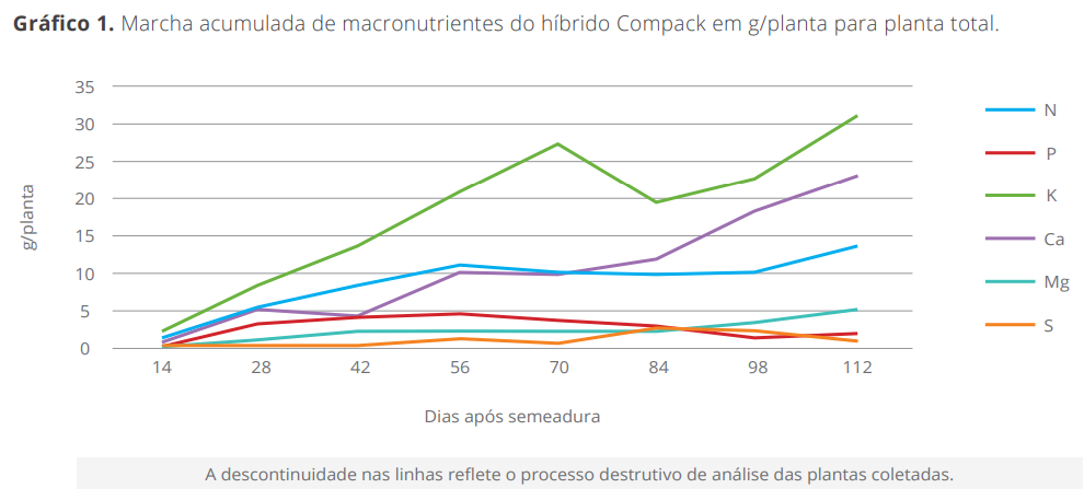 A demanda de nutrientes é influenciada por fatores como cultivares e condições de clima e solo onde as plantas são cultivadas. Este spotlight tem como objetivo expor o trabalho realizado para quantificar a extração (demanda) de nutrientes sob condições de campo aberto nos híbridos Compack e Coronel (SVTH0361). Conhecer a necessidade nutricional das plantas, confrontada com as quantidades disponíveis no solo, permite estimar a necessidade ou não de fertilizações e a otimização das suplementações na quantidade e no tempo correto.