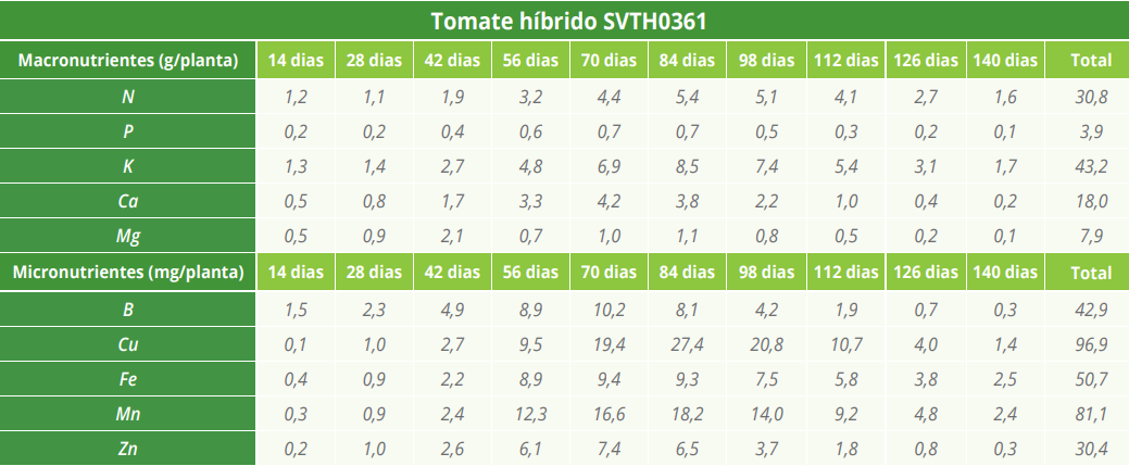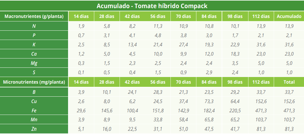 Para o tomate híbrido Compack, o K foi o elemento acumulado em maior quantidade na planta (31,6 g), seguido pelo Ca (23 g), N (13,9 g), Mg (5 g), P (4,8 g) e S (2,9 g). Para os micronutrientes a ordem foi: Fe (471,3 mg), Cu (152,6 mg), Mn (103,7 mg), Zn (81,3 mg) e B (33,7 mg) (LUZ, 2013). A relação N : K observada foi de 1 : 2,27, que é bastante frequente em híbridos de tomate de alta resposta, acentuando-se a partir da primeira antese, aos 42 dias após o transplante, até o final do ciclo produtivo. Essa constatação é clara para o híbrido Compack, que apresenta plantas mais curtas, robustas e menos exigentes em nitrogênio nas fases iniciais. A inversão destes índices ou um aumento no nível de nitrogênio leva inevitavelmente a um vigor excessivo, com problemas potenciais de abortamento de frutos e diâmetro reduzido de frutos.