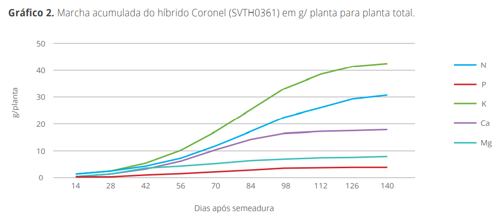 Quanto ao híbrido Coronel (SVTH0361), que apresenta plantas de crescimento vegetativo mais intenso e alta cobertura foliar, a marcha de absorção refletiu o alto potencial produtivo obtido nas condições de Caçador, SC, tradicionalmente reconhecida como um polo de alta produtividade, alcançando 128 toneladas de produção por ha no presente ensaio.