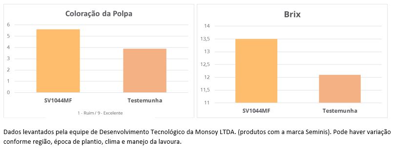 Seus frutos são de ótimo tamanho e uniformidade, pesam em média 1,1 a 1,7Kg. Possuem polpa de cor intensa alaranjada e alto teor de Brix, podendo chegar, na média, a 13-15º.