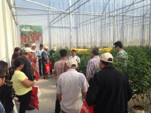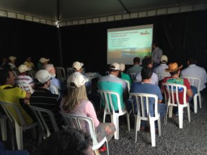 Jorge Hasegawa, Representante de Desenvolvimento Tecnológico) palestrando sobre os tomates e porta-enxertos da Seminis para produtores que visitaram o Projeto MAIS.