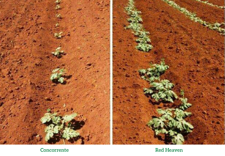 Ambos os materiais foram plantados no mesmo dia e receberam o mesmo tratamento. A Red Heaven, porém, estava um passo à frente da concorrência, apresentando melhor arranque inicial, boa sanidade foliar e alta resistência a viroses.