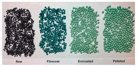 There are three basic types of seed coatings (Figure 1). Filmcoats are very thin and do not change the shape, size, or weight of the seed, and they can help reduce water loss.2 Encrustments are somewhat thicker, making the seed more uniform in shape, more spherical, and slightly heavier. Encrusted seed is easier to plant than non-coated seed when using a vacuum seeder. Pelleted seeds have the thickest coatings, are more uniform in size and shape, and are heavier. Pelleted seeds are easier to handle and plant in operations using belt- or vacuum-seeders. Encrustments and pellets have the added advantage of being able to physically separate seed treatment products from the seed. It has been shown that some insecticides can be phytotoxic, and may result in lower viability and germination if applied directly to the seed. The added layer of material between the seed and product can reduce this problem.