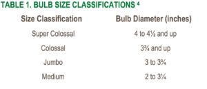 Medium to jumbo sized bulbs are generally grown for fresh market retail, while the large jumbo to super colossal bulbs are preferred for processing. Bulb size does vary among varieties, but size can also be adjusted by changing planting densities.