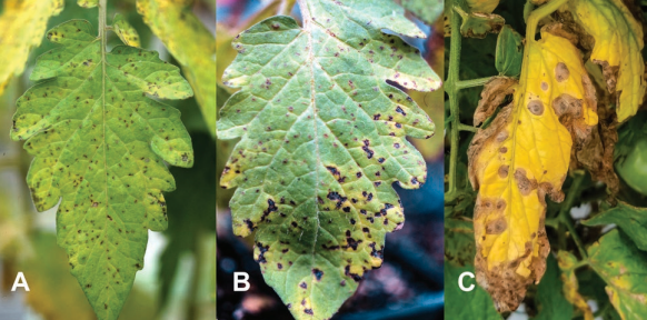 Figure 1. The progression of foliar symptoms of target spot of tomato from (A) initial to (B) intermediate to (C) advanced stages of the disease. Image (C) courtesy Gary Vallad, University of Florida.