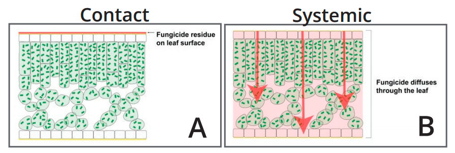 Contact and systemic are terms used to indicate where on or in the plant fungicides are active.2 Contact (non-systemic) fungicides remain on the plant surface (Figure 1A). They do not penetrate into plant tissues. As a result, they are only effective before the pathogens infect the plant.2 Because they are not absorbed into the plant, contact fungicides are susceptible to being washed off of plant surfaces by rain or overhead irrigation. The rainfastness of a product will depend on its chemical characteristics and the addition of any adjuvants such as spreader-stickers. However, a commonly used guideline is that one inch of rain will remove approximately 50% of fungicide residue, and two inches of rain will remove most of the residue of a contact fungicide from a plant surface.3 Contact fungicides are also susceptible to degradation from other environmental factors, such as UV light, heat, and microbial activity. Plant tissues that grow after a contact fungicide is applied will not be protected.3 Most protectant fungicides are contact fungicides. Systemic fungicides are absorbed into the plant to some degree (Figure 1B).2