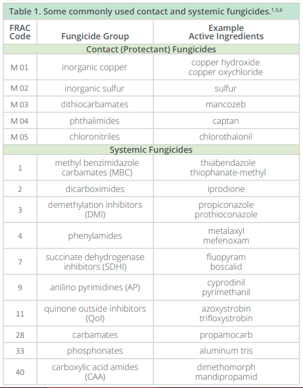» Systemic fungicides provide some control in the early post-infection period, can move to protect unsprayed plant tissues, often have single-site modes of action, and may have narrower spectra of activity.