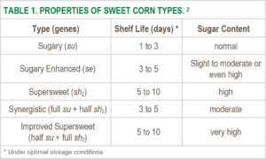 In the past, there was one basic type of sweet corn with the sweetness characteristic conferred by the sugary (su) gene. Over the past 50 years, other types of sweet corn have been developed with the discovery of the sugary enhanced (se) and supersweet (sh2, or shrunken-2) traits, and most recently combinations of these traits have resulted in the synergistic and improved supersweet types (Table 1).1,2