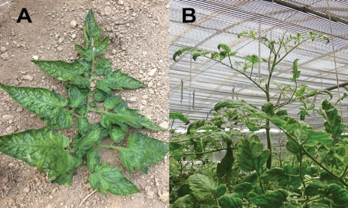 Figure 1. Foliar symptoms of TBRFV infection of tomato: (A) mosaic discoloration of leaves, (B) narrowing and distortion of leaf blades.