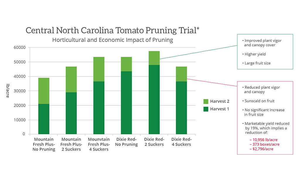 The most common error made by Dixie Red Tomato growers is overpruning. A number of tomato varieties call for pruning four suckers or zero suckers, and sometimes both those strategies are mistakenly applied to the Dixie Red Tomato. But when done correctly (two suckers), pruning your Dixie Red Tomato can improve plant vigorincreases canopy cover and leads to larger fruit sizes with higher yields as seen in the trial data below.