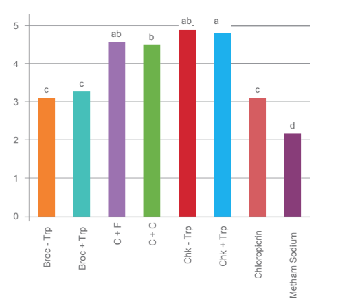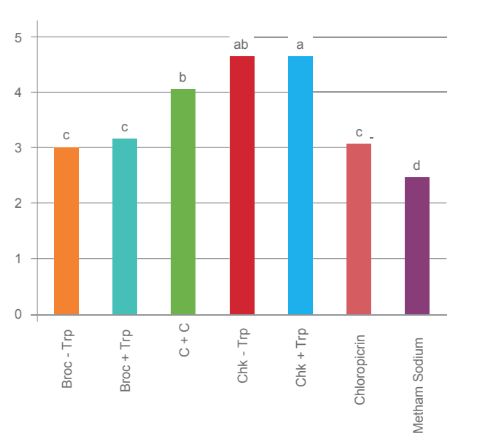 Un estudio de campo, publicado en 1999, demostró que la incorporación del residuo al suelo suprimía los niveles de marchitez por Verticillium en los campos de brócoli y coliflor que siguieron a continuación (figura 1). Un estudio posterior demostró que la rotación del cultivo de fresas en verano, con un campo de brócoli en invierno en California, redujo los niveles del patógeno Verticillium dahliae en el suelo, disminuyendo la severidad del marchitamiento causado por el hongo en las fresas, además de producir un crecimiento mayor de las plantas y una mayor productividad, al compararlo con la rotación de otros cultivos distintos de las brassicas.