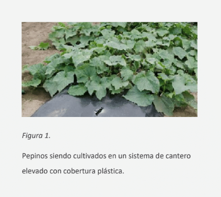 El pepino para cortar en rodajas se cultiva tanto en suelo descubierto como a través del sistema de acolchado de plástico (mulching), en canteros elevados. Comparativamente, los sistemas de suelo descubierto tienen menores costos de insumos; sin embargo, los sistemas de cobertura plástica proporcionan una producción más temprana y mayores rendimientos. La cobertura de plástico negro sobre mesas de cultivo (Figura 1) brinda temperaturas del suelo más elevadas en las cosechas de invierno o de transición, proporcionando una germinación rápida y el desarrollo anticipado de los frutos. Durante los meses calurosos del verano, las coberturas plásticas blancas/ plateadas se utilizan para evitar el sobrecalentamiento del suelo. Otros beneficios del sistema de cobertura plástica son el control de malezas, el aumento de la eficiencia del riego, principalmente en los sistemas de riego por goteo, y un mejor manejo de los fertilizantes. Las desventajas de estos sistemas son el mayor costo de producción y la necesidad de desechar el plástico al final de la cosecha.3