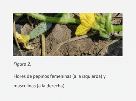 Cada variedad de pepino produce un tipo de flor diferente. Los pepinos estándar son monoicos, lo que significa que producen flores masculinas y femeninas en la misma planta, las flores masculinas producen polen y el fruto se desarrolla solamente a partir de las flores femeninas (Figura 2). La mayoría de las flores en estas variedades son del sexo masculino. Algunas variedades son ginoicas, ya que solo producen flores femeninas. Estas variedades precisan ser plantadas cerca de variedades polinizadoras que producen flores masculinas, ya que no producen polen por sí mismas. Algunas variedades son “predominantemente femeninas”, produciendo principalmente flores femeninas, y existen algunas variedades experimentales que son hermafroditas, donde las flores cuentan con estructuras masculinas y femeninas. Es importante considerar el tipo y el número de flores presentes en una variedad ya que pueden ser necesarias medidas especiales para garantizar un suministro adecuado de polen. Si se plantan variedades ginoicas o predominantemente femeninas, será necesario plantar plantas polinizadoras con flores masculinas junto con la variedad productora.3 La mayoría de las empresas de semillas coloca variedades polinizadoras en el embalaje (15-20%), eliminando la necesidad de comprar una variedad polinizadora de forma separada.