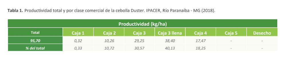 La relación N: K2O para el híbrido Duster fue de 1: 1,11, y las extracciones relativas de N, P2O5 y K2O (kg de nutriente por tonelada de cebolla producida) fueron 1,83; 0,66 y 2,02 kg/tonelada, respectivamente.
