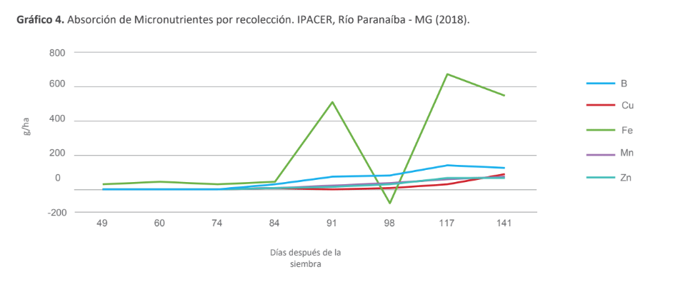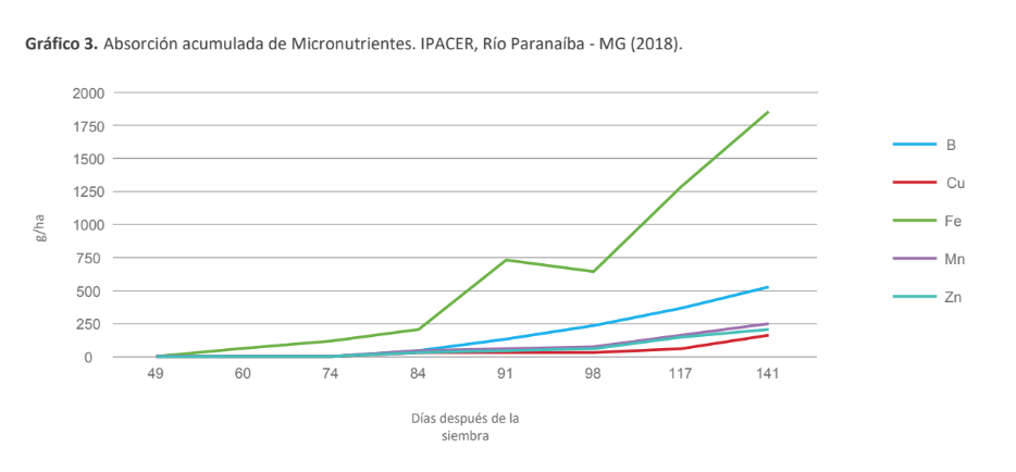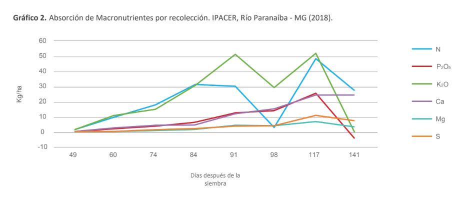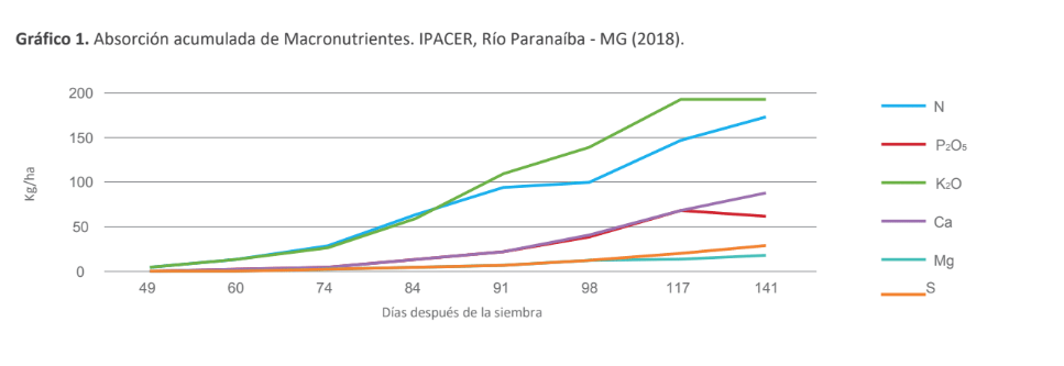 La extracción de nutrientes se determinó por el producto entre la producción de materia seca y el número de nutrientes en el tejido vegetal. Las curvas de absorción se generaron trazando el contenido de nutrientes en las hojas, el tallo y la inflorescencia en cada momento de muestreo para cada nutriente.