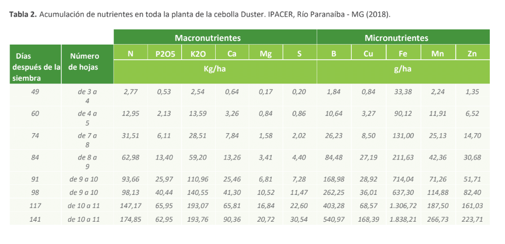 1. IPACER - Instituto de Pesquisa Agrícola del Cerrado. 2018. Curva de acumulación de nutrientes para el cultivo de cebolla, variedad Duster - Cosecha 2018. Río Paranaíba, MG.
