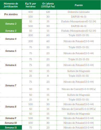 • Dolomita calcinada: 400/ha para corregir el pH si hay necesidad. Se debe aplica mínimo 3 semanas antes de la siembra.