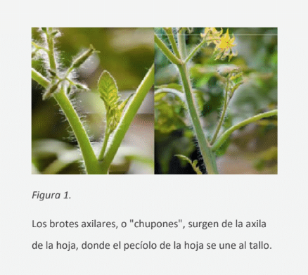 La poda de brotes del tomate consiste en retirar los brotes axilares, comúnmente conocidos como “chupones”, que brotan a lo largo de todos los vástagos de la planta. Los "chupones" se desarrollan a partir de la axila donde el pecíolo de la hoja se une al tronco, formándose en cada nudo de la hoja (Figura 1). Si no son retirados, los “chupones” se desarrollan como brotes que producen hojas y frutos. El follaje adicional y los tejidos del fruto compiten con el resto de la planta por el agua, los nutrientes y la luz, lo que suele dar lugar a más frutos, pero más pequeños.