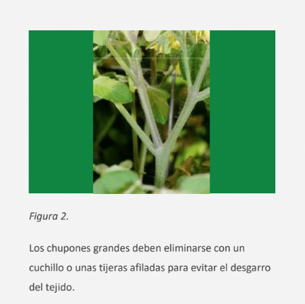 Los “chupones” menores pueden ser fácilmente retirados con los dedos, en un movimiento hacia los lados hasta partirlos. Los “chupones” mayores deben ser retirados con un cuchillo o tijeras afiladas para evitar el desgarro del tejido. Una recomendación estándar para variedades determinadas es retirar todos los “chupones” (cinco o seis) ubicados inmediatamente debajo del primer conjunto de flores (Figura 3). Todos los "chupones" por encima de la primera serie de frutos se deben dejar que crezcan y produzcan frutos. En las variedades fuertemente determinadas, a veces se recomienda dejar uno o dos "chupones" debajo del primer racimo de frutos para mejorar el rendimiento global. 4